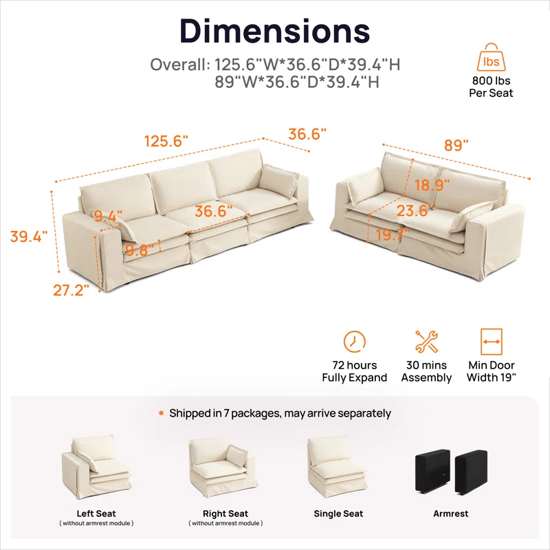125″ Oversized 2-piece Couch Sets For Living Room, Washable Removable Slipcover